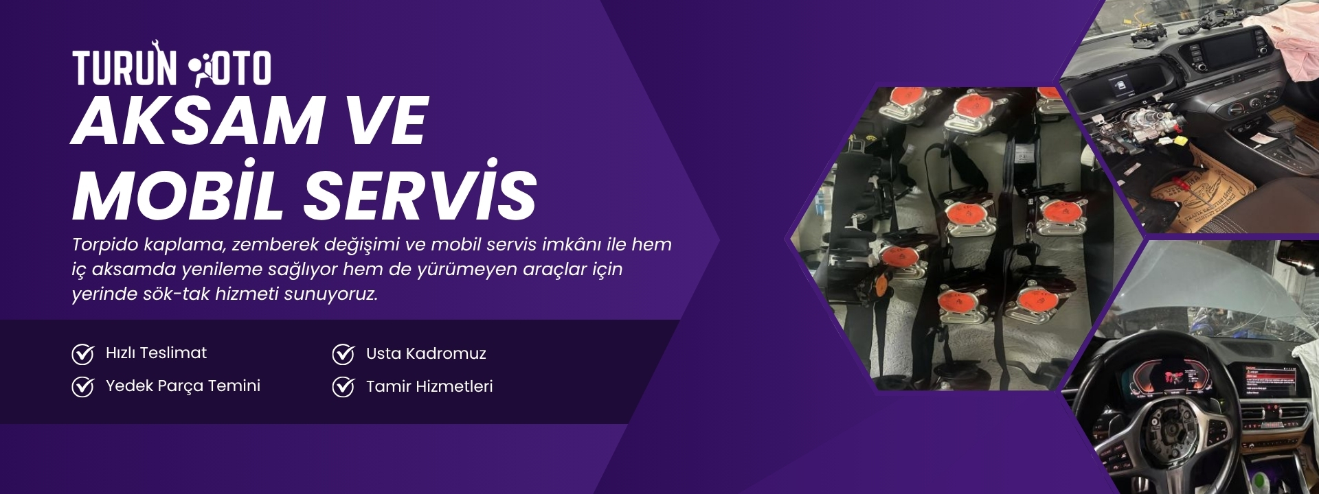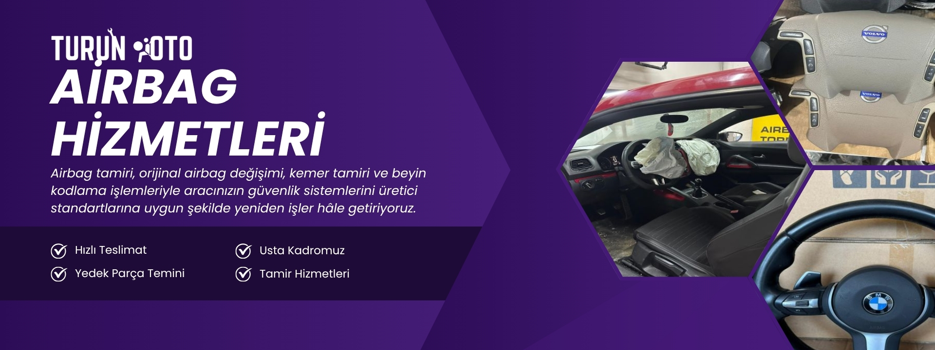 Turun Oto Airbag, araç güvenlik sistemleri ve airbag uygulamaları alanında uzmanlaşmış profesyonel bir servistir. Airbag tamiri, orijinal airbag değişimi, kemer tamiri, beyin kodlama, torpido kaplama ve zemberek değişimi gibi işlemlerde teknik bilgi ve deneyimi bir araya getiririz. Her aracın güvenlik standartlarını üretici kriterlerine uygun hâle getirmeyi temel sorumluluğumuz olarak görürüz. Mobil hizmet imkânımız ile yürümeyen araçlara yerinde müdahale ederek müşterilerimize zaman ve operasyonel kolaylık sağlarız. Güvenilir, şeffaf ve çözüm odaklı yaklaşımımızla, sürücü ve yolcu güvenliğini merkeze alan bir hizmet anlayışı benimsiyoruz.